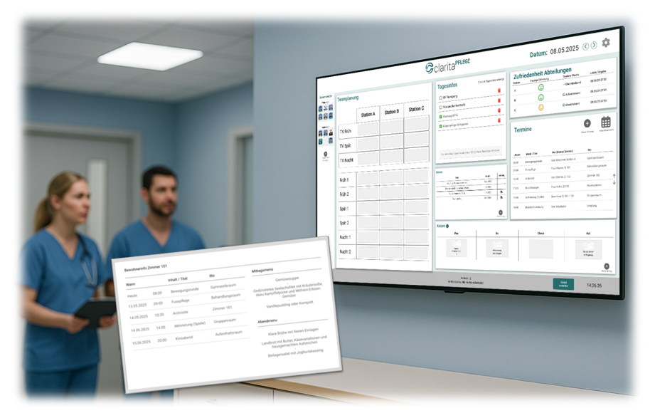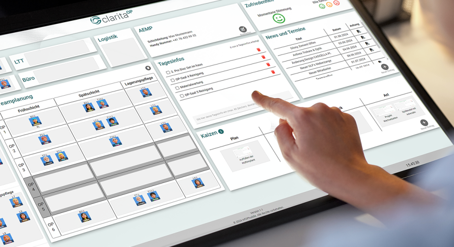 ✔️ Wir haben die Lösung: Digitales Huddleboard claritaOP, claritaNOTFALL & claritaPFLEGE – für Spitäler, Rehakliniken, Psychiatrien und die Langzeitpflege